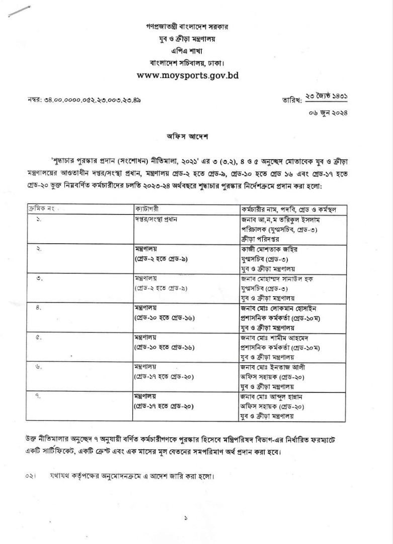যুব ও ক্রীড়া মন্ত্রণালয়ের আওতাধীন দপ্তর প্রধান হিসেবে ক্রীড়া পরিদপ্তর এর পরিচালক চলতি ২০২৩-২০২৪ অর্থবছরে শুদ্ধাচার পুরস্কার পাওয়ায় ক্রীড়া পরিদপ্তর এর পক্ষ থেকে প্রাণঢালা শুভেচ্ছা ও অভিনন্দন।